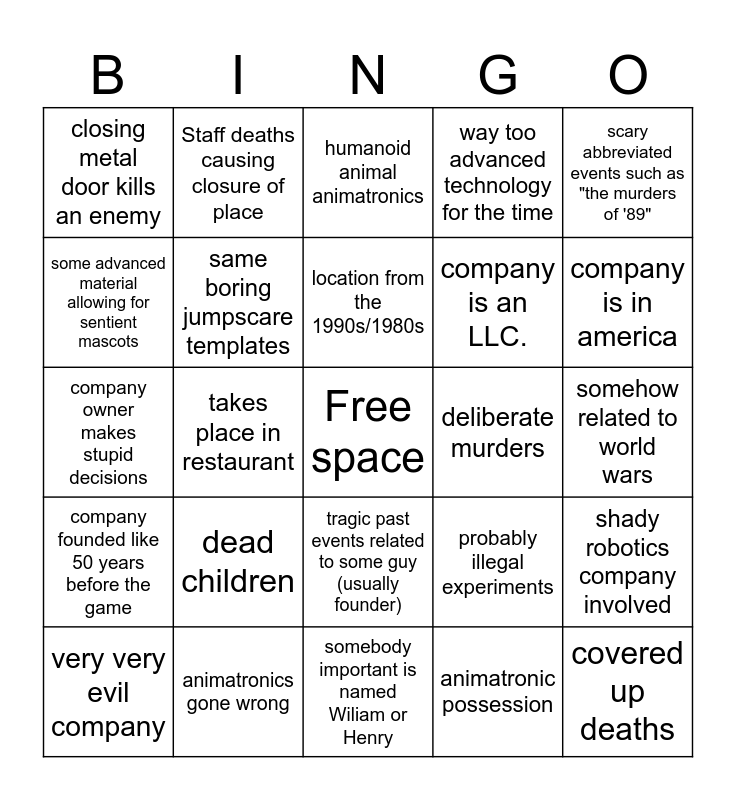This bingo card has a free space and 24 words: dead children, animatronics gone wrong, location from the 1990s/1980s, very very evil company, scary abbreviated events such as "the murders of '89", closing metal door kills an enemy, some advanced material allowing for sentient mascots, Staff deaths causing closure of place, deliberate murders, tragic past events related to some guy (usually founder), company is an LLC., company owner makes stupid decisions, probably illegal experiments, shady robotics company involved, same boring jumpscare templates, animatronic possession, somehow related to world wars, humanoid animal animatronics, company is in america, takes place in restaurant, covered up deaths, company founded like 50 years before the game, way too advanced technology for the time and somebody important is named Wiliam or Henry.