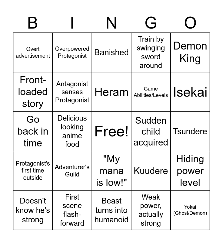 This bingo card has a free space and 42 words: Useless Protagonist, Overpowered Protagonist, 1,000 y/o Loli, Kuudere, Tsundere, Doesn't know he's strong, Adventurer's Guild, Dungeon, Game Abilities/Levels, Isekai, Go back in time, Delicious looking anime food, Beast turns into humanoid, Sudden child acquired, Yokai (Ghost/Demon), Protagonist's first time outside, Overtly sexual (sus), Heram, Slavery, Demon King, Front-loaded story, Tournament, Pervy Protagonist / Sidekick, Train by swinging sword around, Power-up by dropping weight, Wearing weight for training, Antagonist senses Protagonist, Sense killing intent, Sense power level, Hiding power level, Beach episode, First scene flash-forward, Banished, Weak power, actually strong, Unnecessarily long title of the anime you are watching, but maybe not for long, Cute animal familiar, Magic contract with animals, "My mana is low!", Ancient powerful/sentient weapon, Item box, Overt advertisement and Loyal maid/butler.