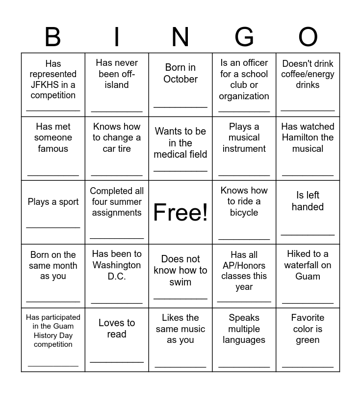 This bingo card has a free space and 24 words: Has been to Washington D.C. __________, Loves to read __________, Wants to be in the medical field __________, Has participated in the Guam History Day competition ____________, Doesn't drink coffee/energy drinks ___________, Has represented JFKHS in a competition ___________, Has met someone famous __________, Has never been off-island __________, Knows how to ride a bicycle __________, Does not know how to swim __________, Plays a musical instrument __________, Plays a sport ___________, Has all AP/Honors classes this year ___________, Hiked to a waterfall on Guam __________, Knows how to change a car tire __________, Speaks multiple languages __________, Is left handed __________, Born in October __________, Has watched Hamilton the musical __________, Completed all four summer assignments ___________, Favorite color is green __________, Born on the same month as you ___________, Is an officer for a school club or organization __________ and Likes the same music as you __________.