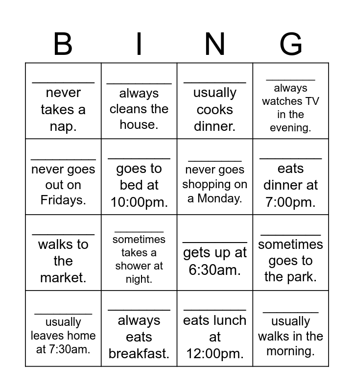 This bingo card has 16 words: ________ always eats breakfast., ________ sometimes goes to the park., ________ usually cooks dinner., ________ never takes a nap., ________ walks to the market., _________ always cleans the house., ________ gets up at 6:30am., ________ eats lunch at 12:00pm., _________ never goes out on Fridays., ________ goes to bed at 10:00pm., _________ usually leaves home at 7:30am., ________ always watches TV in the evening., ________ sometimes takes a shower at night., ________ eats dinner at 7:00pm., ________ never goes shopping on a Monday. and ________ usually walks in the morning..