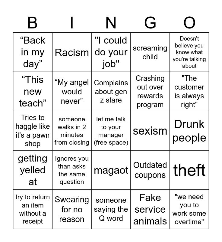 This bingo card has a free space and 24 words: Ignores you than asks the same question, Swearing for no reason, Complains about gen z stare, try to return an item without a receipt, Doesn't believe you know what you're talking about, “Back in my day”, “This new teach”, Racism, sexism, magaot, Crashing out over rewards program, Tries to haggle like it's a pawn shop, Outdated coupons, theft, “My angel would never”, Fake service animals, Drunk people, "I could do your job", "The customer is always right", someone walks in 2 minutes from closing, "we need you to work some overtime", getting yelled at, screaming child and someone saying the Q word.