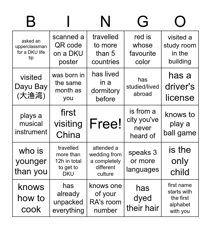 This bingo card has a free space and 24 words: travelled more than 12h in total to get to DKU, has already unpacked everything, has lived in a dormitory before, knows how to cook, visited a study room in the building, asked an upperclassman for a DKU life tip, visited Dayu Bay (大渔湾), scanned a QR code on a DKU poster, is from a city you've never heard of, attended a wedding from a completely different culture, has studied/lived abroad, plays a musical instrument, speaks 3 or more languages, is the only child, was born in the same month as you, has dyed their hair, knows to play a ball game, travelled to more than 5 countries, has a driver's license, first visiting China, first name starts with the first alphabet with you, who is younger than you, red is whose favourite color and knows one of your RA's room number.