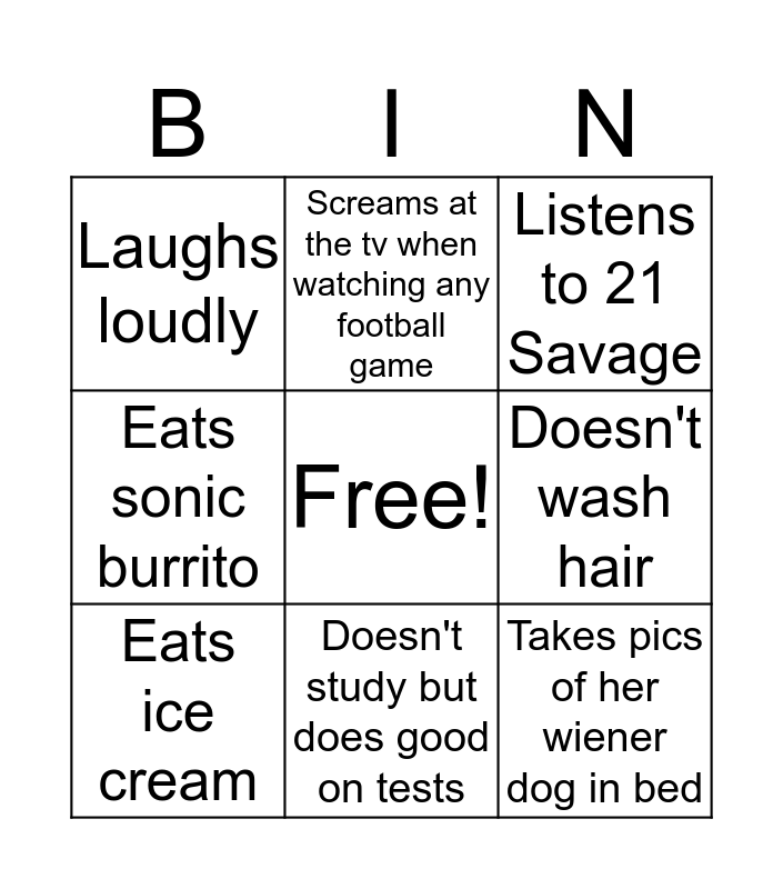 This bingo card has a free space and 8 words: Doesn't wash hair, Listens to 21 Savage, Screams at the tv when watching any football game, Eats ice cream, Laughs loudly, Takes pics of her wiener dog in bed, Eats sonic burrito and Doesn't study but does good on tests.