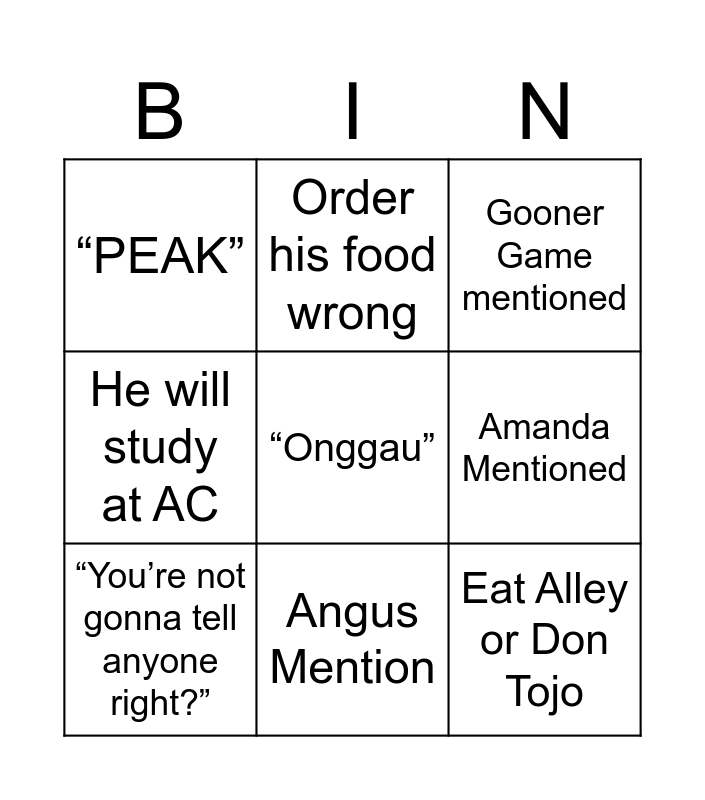 This bingo card has a free space and 8 words: Amanda Mentioned, Gooner Game mentioned, Order his food wrong, “You’re not gonna tell anyone right?”, “PEAK”, Eat Alley or Don Tojo, He will study at AC and Angus Mention.
