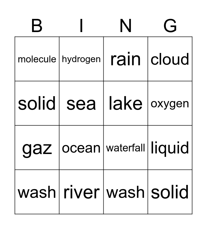 This bingo card has 16 words: river, liquid, rain, molecule, gaz, hydrogen, waterfall, wash, solid, sea, wash, cloud, ocean, oxygen, lake and solid.