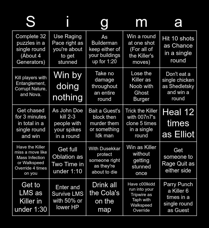 This bingo card has a free space and 24 words: Get full Oblation as Two Time in under 1:10, Enter and Survive LMS with 50% or lower HP, Take no damage throughout an entire round, Get to LMS as Killer in under 1:30, Hit 10 shots as Chance in a single round, Complete 32 puzzles in a single round (About 4 Generators), Kill players with Entanglement, Corrupt Nature, and Nova., Use Raging Pace right as you're about to get stunned, Trick the Killer with 007n7's clone 5 times in a single round, With Dusekkar protect someone right as they're about to die, Lose the Killer as Noob with Ghost Burger, Get chased for 3 minutes in total in a single round and win, Win as Killer without getting stunned once, Get someone to Rage Quit as either side, Win by doing nothing, Have c00lkidd run into your Tripwire as Taph with Walkspeed Override, Heal 12 times as Elliot, As Builderman keep either of your buildings up for 1:20, Don't eat a single chicken as Shedletsky and win a round, As John Doe kill 2-3 people with your spikes in a round, Parry Punch a Killer 6 times in a single round as Guest, Have the Killer miss a move like Mass Infection or Walkspeed Override 4 times on you, Win a round at one shot (For all of the Killer's moves) and Drink all the Cola's on the map.
