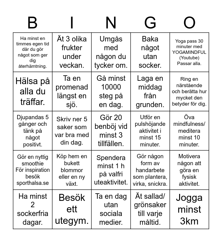 This bingo card has a free space and 24 words: Köp hem en bukett blommor eller en ny växt., Besök ett utegym., Gå minst 10000 steg på en dag., Ha minst 2 sockerfria dagar., Yoga pass 30 minuter med YOGAMINDFUL (Youtube) Passar alla., Ha minst en timmes egen tid där du gör något som ger dig återhämtning., Hälsa på alla du träffar., Ät 3 olika frukter under veckan., Utför en pulshöjande aktivitet i minst 15 minuter., Spendera minst 1 h på valfri uteaktivitet., Laga en middag från grunden., Djupandas 5 gånger och tänk på något positivt., Gör någon form av handarbete som plantera, virka, snickra., Motivera någon att göra en fysisk aktivitet., Ta en promenad längst en sjö., Ät sallad/ grönsaker till varje måltid., Öva mindfulness/ meditera minst 10 minuter., Umgås med någon du tycker om., Ring en närstående och berätta hur mycket den betyder för dig., Skriv ner 5 saker som var bra med din dag., Jogga minst 3km, Gör en nyttig smoothie För inspiration besök sporthalsa.se, Baka något utan socker. and Ta en dag utan sociala medier..