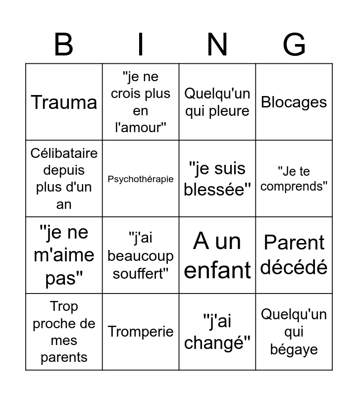This bingo card has 16 words: Tromperie, Parent décédé, Quelqu'un qui pleure, Trauma, ''je ne m'aime pas'', ''je ne crois plus en l'amour'', A un enfant, ''j'ai changé'', Célibataire depuis plus d'un an, Psychothérapie, Trop proche de mes parents, Blocages, ''j'ai beaucoup souffert'', ''Je te comprends'', ''je suis blessée'' and Quelqu'un qui bégaye.