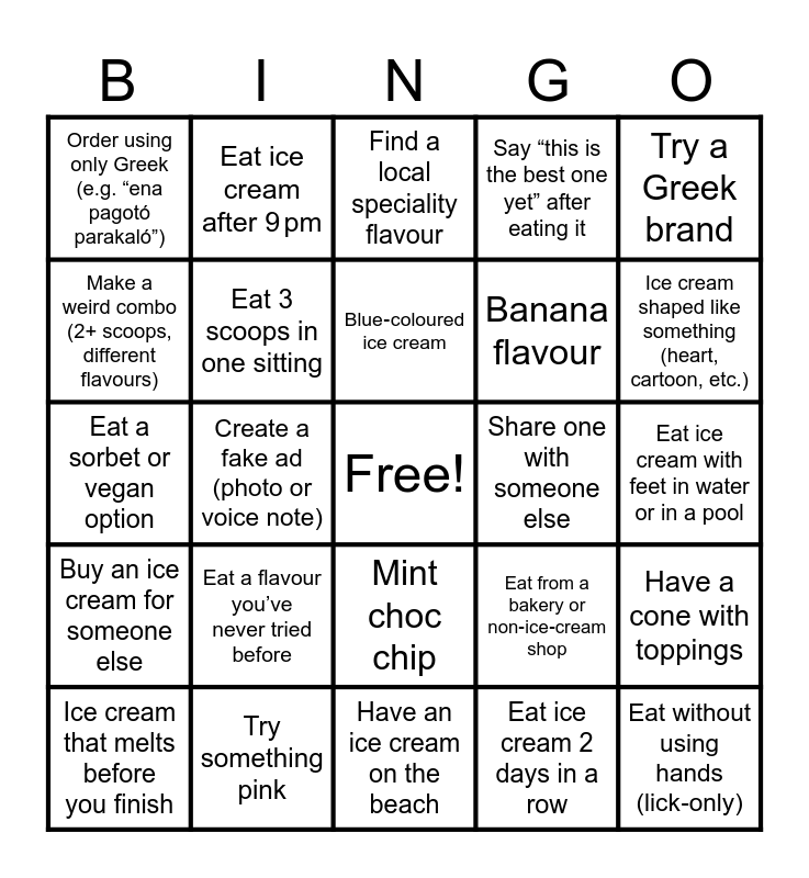 This bingo card has a free space and 25 words: Eat a flavour you’ve never tried before, Have an ice cream on the beach, Blue‑coloured ice cream, Ice cream that melts before you finish, Try a Greek brand, Order using only Greek (e.g. “ena pagotó parakaló”), Make a weird combo (2+ scoops, different flavours), Eat ice cream after 9 pm, Share one with someone else, Mint choc chip, Banana flavour, Eat a sorbet or vegan option, Eat from a bakery or non‑ice‑cream shop, Have a cone with toppings, Eat 3 scoops in one sitting, Take a photo with your ice cream, Eat ice cream with feet in water or in a pool, Find a local speciality flavour, Ice cream shaped like something (heart, cartoon, etc.), Create a fake ad (photo or voice note), Eat without using hands (lick‑only), Try something pink, Buy an ice cream for someone else, Say “this is the best one yet” after eating it and Eat ice cream 2 days in a row.