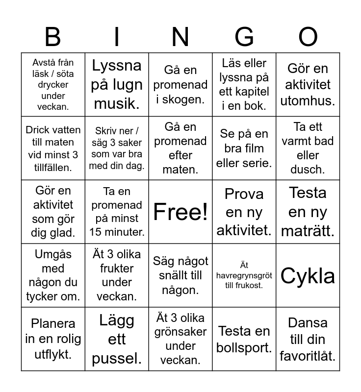 This bingo card has a free space and 24 words: Ät 3 olika frukter under veckan., Lägg ett pussel., Gå en promenad efter maten., Planera in en rolig utflykt., Gör en aktivitet utomhus., Avstå från läsk / söta drycker under veckan., Drick vatten till maten vid minst 3 tillfällen., Lyssna på lugn musik., Prova en ny aktivitet., Säg något snällt till någon., Se på en bra film eller serie., Gör en aktivitet som gör dig glad., Ät havregrynsgröt till frukost., Cykla, Skriv ner / säg 3 saker som var bra med din dag., Testa en bollsport., Testa en ny maträtt., Gå en promenad i skogen., Ta ett varmt bad eller dusch., Ta en promenad på minst 15 minuter., Dansa till din favoritlåt., Umgås med någon du tycker om., Läs eller lyssna på ett kapitel i en bok. and Ät 3 olika grönsaker under veckan..