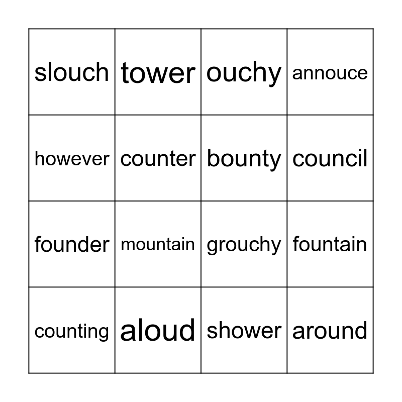 This bingo card has 24 words: surround, allow, council, vowel, however, slouch, counter, tower, aloud, powder, founder, grouchy, amount, brownie, bounty, voucher, shower, ouchy, mountain, fountain, counting, around, annouce and powerful.