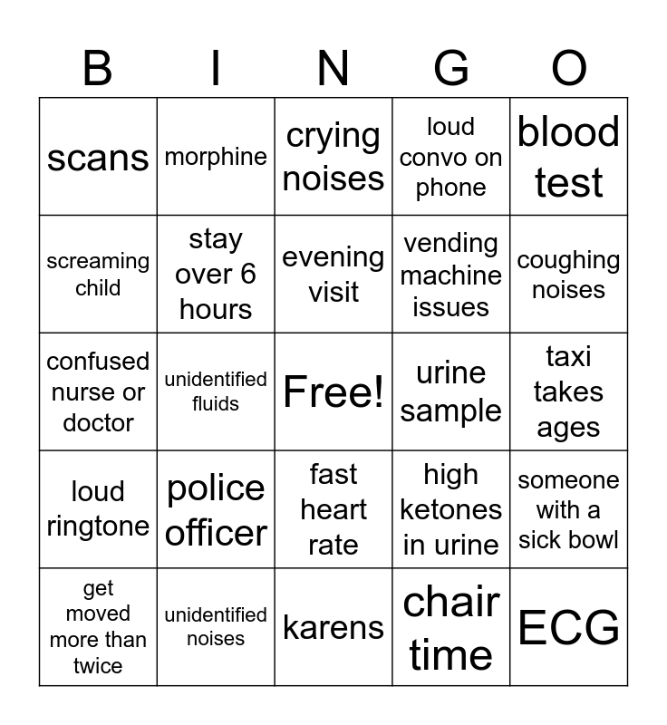 This bingo card has a free space and 24 words: police officer, unidentified noises, evening visit, get moved more than twice, blood test, scans, screaming child, morphine, urine sample, fast heart rate, vending machine issues, confused nurse or doctor, high ketones in urine, someone with a sick bowl, stay over 6 hours, chair time, taxi takes ages, crying noises, coughing noises, unidentified fluids, ECG, loud ringtone, loud convo on phone and karens.