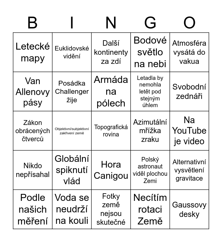 This bingo card has a free space and 24 words: Globální spiknutí vlád, Voda se neudrží na kouli, Armáda na pólech, Podle našich měření, Atmosféra vysátá do vakua, Letecké mapy, Van Allenovy pásy, Euklidovské vidění, Azimutální mřížka zraku, Hora Canigou, Letadla by nemohla letět pod stejným úhlem, Zákon obrácených čtverců, Polský astronaut viděl plochou Zemi, Alternativní vysvětlení gravitace, Posádka Challenger žije, Necítím rotaci Země, Na YouTube je video, Další kontinenty za zdí, Svobodní zednáři, Objektivní/subjektivní zakřivení země, Gaussovy desky, Nikdo nepřísahal, Bodové světlo na nebi and Fotky země nejsou skutečné.