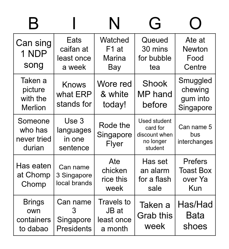 This bingo card has 35 words: Participated in an NDP parade, Used SkillsFuture Credits, Shopped on Shopee or Lazada this week, Knows what ERP stands for, Ate chicken rice this week, Queued 30 mins for bubble tea, Taken a picture with the Merlion, Caught a movie at The Projector, Wore red & white today!, Can recite the National Pledge, Someone who has never tried durian, Ate at Newton Food Centre, Knows what MRT stands for, Name 3 Singapore dishes, Can sing 1 NDP song, Used student card for discount when no longer student, Taken a Grab this week, Use 3 languages in one sentence, Has eaten at Chomp Chomp, Rode the Singapore Flyer, Has set an alarm for a flash sale, Brings own containers to dabao, Prefers Toast Box over Ya Kun, Can name 3 Singapore Presidents, Watched F1 at Marina Bay, Smuggled chewing gum into Singapore, Has/Had Bata shoes, Had Milo from the Milo Van, Shook MP hand before, Can name 5 bus interchanges, Chope-d a table with tissue packet, Travels to JB at least once a month, Can name 3 Singapore local brands, Eats caifan at least once a week and Can name the 3 series of old Singapore notes.