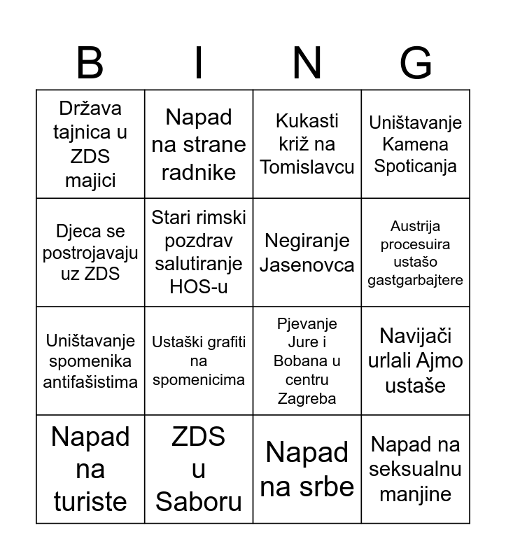 This bingo card has 16 words: ZDS u Saboru, Navijači urlali Ajmo ustaše, Kukasti križ na Tomislavcu, Država tajnica u ZDS majici, Uništavanje spomenika antifašistima, Napad na strane radnike, Pjevanje Jure i Bobana u centru Zagreba, Napad na srbe, Djeca se postrojavaju uz ZDS, Stari rimski pozdrav salutiranje HOS-u, Napad na turiste, Uništavanje Kamena Spoticanja, Ustaški grafiti na spomenicima, Austrija procesuira ustašo gastgarbajtere, Negiranje Jasenovca and Napad na seksualnu manjine.