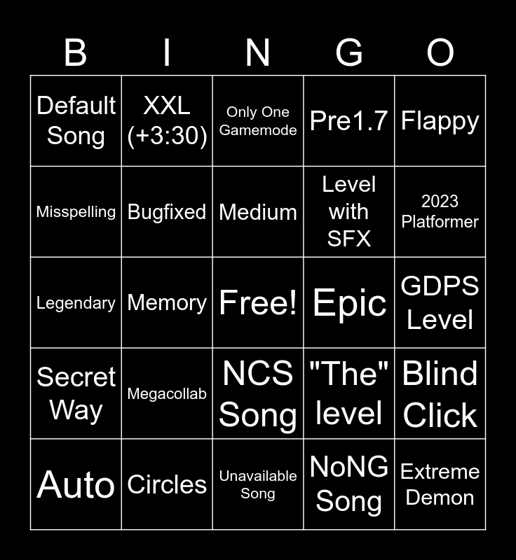 This bingo card has a free space and 44 words: 2-Player, Extreme Demon, Bugged, Auto, Underrated, NoNG Song, Only One Gamemode, +1M likes, Flappy, Circles, Pre1.7, Epic, NCS Song, Megacollab, Collab, Unavailable Song, Minigame, Legendary, Only Consonants, 2023 Platformer, XXL (+3:30), Mythic, Only Numbers, Default Song, Only Vocals, GDPS Level, CC Level, Named after someone with Creator Points, "The" level, Secret Way, +100k Objects, Blind Click, Remake, Disliked, Memory, Updated with coins, Tiny, Short, Medium, Misspelling, Level with SFX, Green User, Bugfixed and Creator is in top 100.