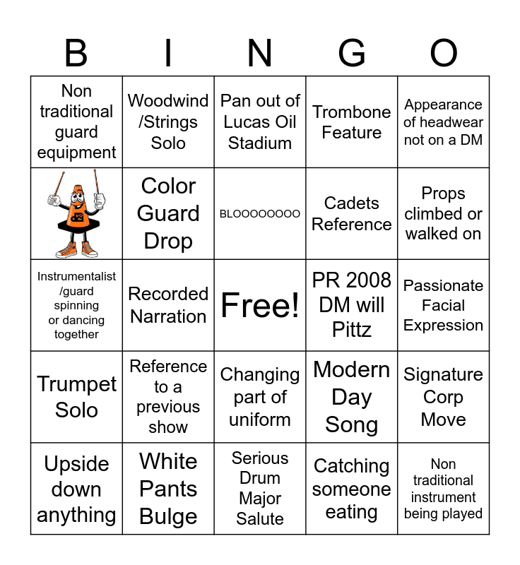 This bingo card has 1 images, a free space and 23 words: Reference to a previous show, White Pants Bulge, BLOOOOOOOO, Upside down anything, Appearance of headwear not on a DM, Non traditional guard equipment, Woodwind /Strings Solo, PR 2008 DM will Pittz, Changing part of uniform, Cadets Reference, Instrumentalist /guard spinning or dancing together, Modern Day Song, Signature Corp Move, Color Guard Drop, Catching someone eating, Passionate Facial Expression, Pan out of Lucas Oil Stadium, Props climbed or walked on, Recorded Narration, Non traditional instrument being played, Trumpet Solo, Trombone Feature and Serious Drum Major Salute.