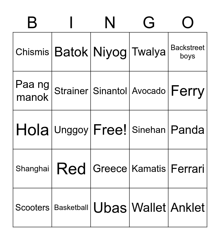 This bingo card has a free space and 24 words: Red, Basketball, Sinantol, Scooters, Backstreet boys, Chismis, Paa ng manok, Batok, Sinehan, Greece, Avocado, Hola, Kamatis, Ferrari, Strainer, Wallet, Panda, Niyog, Ferry, Unggoy, Anklet, Shanghai, Twalya and Ubas.