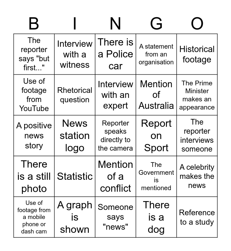 This bingo card has a free space and 24 words: Statistic, A graph is shown, Interview with an expert, Use of footage from a mobile phone or dash cam, Historical footage, The reporter says "but first...", Use of footage from YouTube, Interview with a witness, Report on Sport, Mention of a conflict, Mention of Australia, A positive news story, The Government is mentioned, A celebrity makes the news, Rhetorical question, There is a dog, The reporter interviews someone, There is a Police car, The Prime Minister makes an appearance, News station logo, Reference to a study, There is a still photo, A statement from an organisation and Someone says "news".