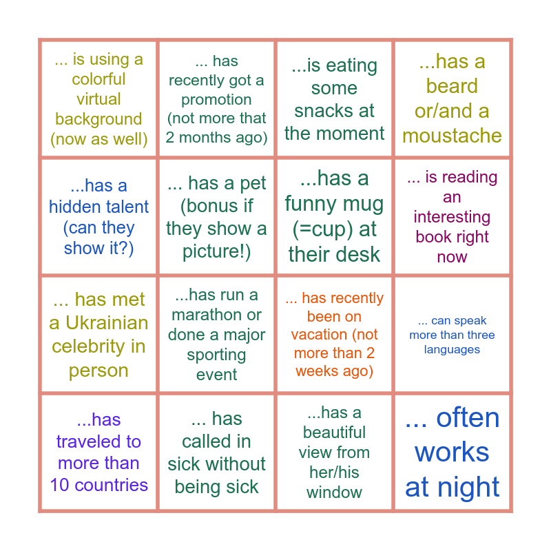 This bingo card has 16 words: ... has called in sick without being sick, ... can speak more than three languages, ...is eating some snacks at the moment, ... is using a colorful virtual background (now as well), ... has met a Ukrainian celebrity in person, ... has recently got a promotion (not more that 2 months ago), ... has recently been on vacation (not more than 2 weeks ago), ...has a beautiful view from her/his window, ...has a hidden talent (can they show it?), ... has a pet (bonus if they show a picture!), ...has traveled to more than 10 countries, ...has a beard or/and a moustache, ...has run a marathon or done a major sporting event, ... is reading an interesting book right now, ...has a funny mug (=cup) at their desk and ... often works at night.