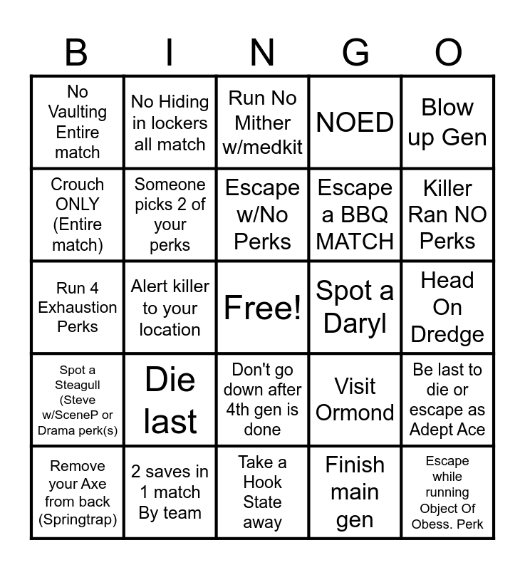 This bingo card has a free space and 24 words: Die last, 2 saves in 1 match By team, Escape w/No Perks, Remove your Axe from back (Springtrap), Blow up Gen, No Vaulting Entire match, Crouch ONLY (Entire match), No Hiding in lockers all match, Spot a Daryl, Don't go down after 4th gen is done, Escape a BBQ MATCH, Run 4 Exhaustion Perks, Visit Ormond, Be last to die or escape as Adept Ace, Someone picks 2 of your perks, Finish main gen, Head On Dredge, Run No Mither w/medkit, Killer Ran NO Perks, Alert killer to your location, Escape while running Object Of Obess. Perk, Spot a Steagull (Steve w/SceneP or Drama perk(s), NOED and Take a Hook State away.