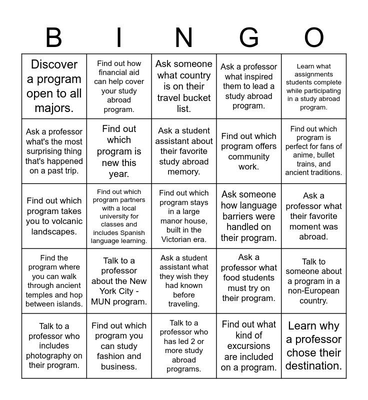 This bingo card has 25 words: Talk to a professor about the New York City - MUN program., Talk to a professor who has led 2 or more study abroad programs., Ask a student assistant about their favorite study abroad memory., Talk to a professor who includes photography on their program., Learn what assignments students complete while participating in a study abroad program., Discover a program open to all majors., Ask a professor what's the most surprising thing that's happened on a past trip., Find out how financial aid can help cover your study abroad program., Ask someone how language barriers were handled on their program., Ask a student assistant what they wish they had known before traveling., Find out which program offers community work., Find out which program takes you to volcanic landscapes., Ask a professor what food students must try on their program., Talk to someone about a program in a non-European country., Find out which program is new this year., Learn why a professor chose their destination., Ask a professor what their favorite moment was abroad., Ask someone what country is on their travel bucket list., Find out which program is perfect for fans of anime, bullet trains, and ancient traditions., Find out which program partners with a local university for classes and includes Spanish language learning., Find out which program stays in a large manor house, built in the Victorian era., Find out which program you can study fashion and business., Find the program where you can walk through ancient temples and hop between islands., Ask a professor what inspired them to lead a study abroad program. and Find out what kind of excursions are included on a program..