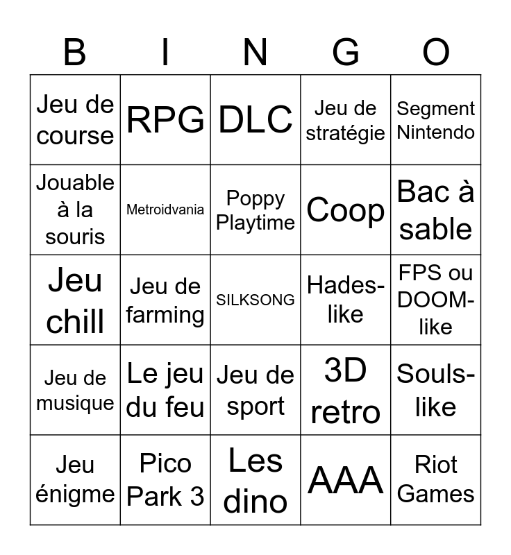 This bingo card has a free space and 24 words: Le jeu du feu, Pico Park 3, Poppy Playtime, Jeu énigme, Segment Nintendo, Jeu de course, Jouable à la souris, RPG, Hades-like, Jeu de sport, Coop, Jeu chill, 3D retro, Souls-like, Metroidvania, AAA, FPS ou DOOM-like, DLC, Bac à sable, Jeu de farming, Riot Games, Jeu de musique, Jeu de stratégie and Les dino.