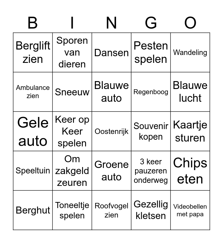 This bingo card has a free space and 39 words: Duitse grens, Bergen, Rode auto, Sneeuw, Berghut, Groene auto, Blauwe auto, Paarse auto, Wandeling, Speeltuin, Keer op Keer spelen, Pesten spelen, Videobellen met papa, Kaartje sturen, Souvenir kopen, Om zakgeld zeuren, Laat opblijven, Berglift zien, Pizza eten, 3 keer pauzeren onderweg, Ambulance zien, Roofvogel zien, Regenboog, Blauwe lucht, Oranje auto, Ijsje eten, Regen, Zwemmen, Dennenboom zien, Sporen van dieren, Dierenpoep, Hele dag droge onderbroek, Dansen, Toneeltje spelen, Gezellig kletsen, Lekker ontbijt, Chips eten, Gele auto and Oostenrijkse grens.