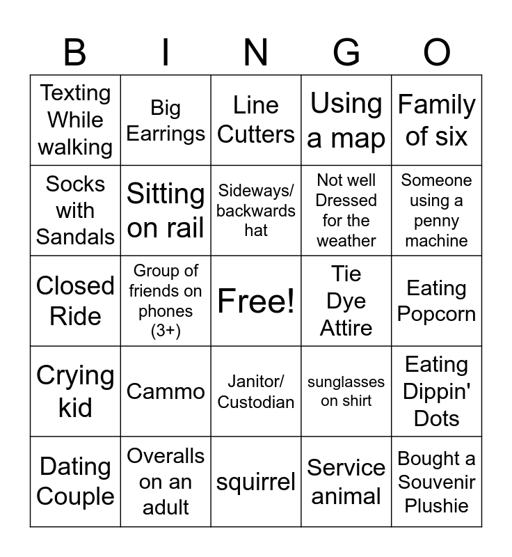This bingo card has a free space and 24 words: Cammo, Overalls on an adult, Sideways/ backwards hat, Dating Couple, Family of six, Texting While walking, Socks with Sandals, Big Earrings, Tie Dye Attire, Janitor/ Custodian, Not well Dressed for the weather, Closed Ride, sunglasses on shirt, Eating Dippin' Dots, Sitting on rail, Service animal, Eating Popcorn, Line Cutters, Someone using a penny machine, Group of friends on phones (3+), Bought a Souvenir Plushie, Crying kid, Using a map and squirrel.
