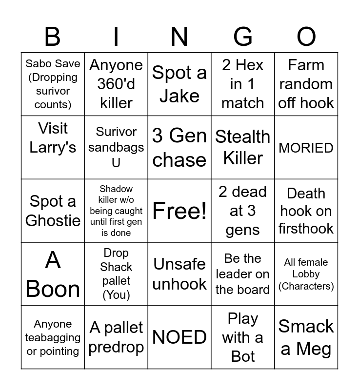 This bingo card has a free space and 24 words: Drop Shack pallet (You), A pallet predrop, 3 Gen chase, Anyone teabagging or pointing, Farm random off hook, Sabo Save (Dropping surivor counts), Visit Larry's, Anyone 360'd killer, 2 dead at 3 gens, Unsafe unhook, Stealth Killer, Spot a Ghostie, Be the leader on the board, All female Lobby (Characters), Surivor sandbags U, Play with a Bot, Death hook on firsthook, Spot a Jake, MORIED, Shadow killer w/o being caught until first gen is done, Smack a Meg, A Boon, 2 Hex in 1 match and NOED.
