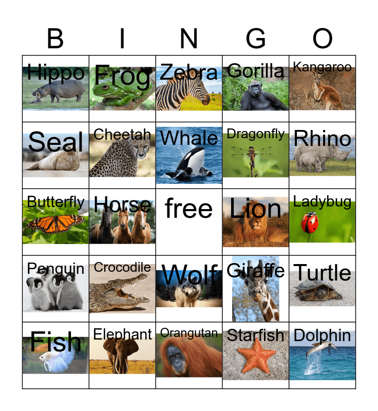 This bingo card has 24 images, a free space and 24 words: Fish, Crocodile, Whale, Starfish, Kangaroo, Hippo, Frog, Zebra, Lion, Ladybug, Butterfly, Cheetah, Giraffe, Turtle, Seal, Elephant, Orangutan, Gorilla, Rhino, Penguin, Horse, Wolf, Dragonfly and Dolphin.