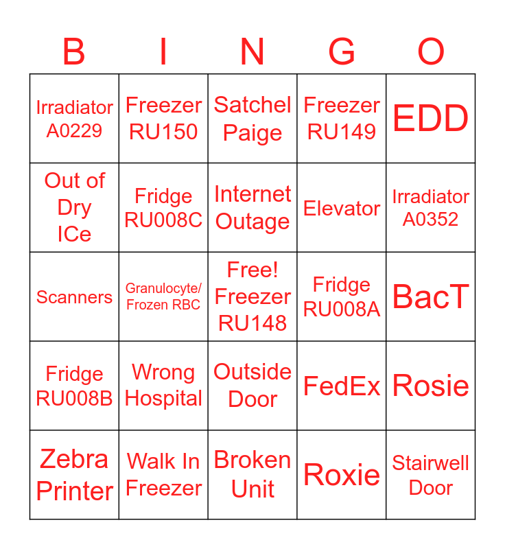 This bingo card has a free space and 24 words: Wrong Hospital, Walk In Freezer, Internet Outage, Zebra Printer, EDD, Irradiator A0229, Out of Dry ICe, Freezer RU150, Fridge RU008A, Outside Door, Elevator, Scanners, FedEx, Rosie, Fridge RU008C, Roxie, BacT, Satchel Paige, Irradiator A0352, Granulocyte/ Frozen RBC, Stairwell Door, Fridge RU008B, Freezer RU149 and Broken Unit.