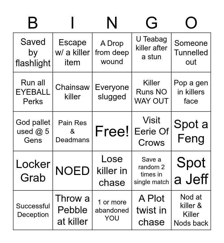 This bingo card has a free space and 24 words: NOED, Throw a Pebble at killer, Everyone slugged, Successful Deception, Someone Tunnelled out, Saved by flashlight, Run all EYEBALL Perks, Escape w/ a killer item, Visit Eerie Of Crows, Lose killer in chase, Killer Runs NO WAY OUT, God pallet used @ 5 Gens, Save a random 2 times in single match, Spot a Jeff, Chainsaw killer, A Plot twist in chase, Spot a Feng, A Drop from deep wound, Pop a gen in killers face, Pain Res & Deadmans, Nod at killer & Killer Nods back, Locker Grab, U Teabag killer after a stun and 1 or more abandoned YOU.