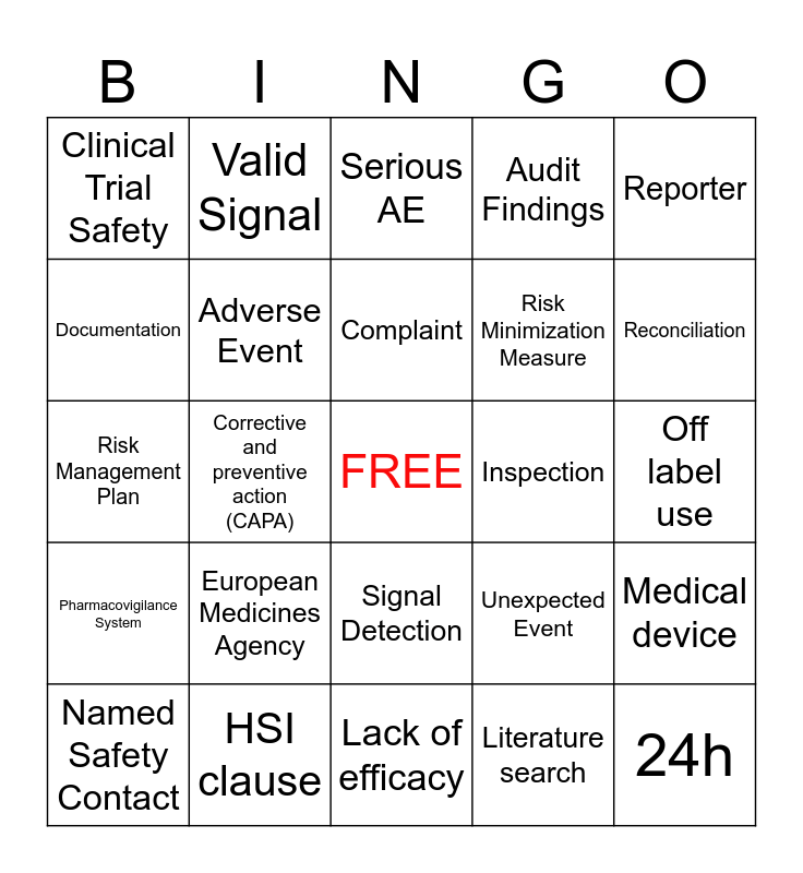 This bingo card has a free space and 29 words: Named Safety Contact, Pharmacovigilance, Corrective and preventive action (CAPA), WHO, Clinical Trial Safety, Serious AE, Adverse Event, European Medicines Agency, Inspection, HSI clause, Off label use, 24h, Lack of efficacy, Literature search, Reconciliation, Black Triangle, Signal Detection, Pharmacovigilance System, Reporter, Risk Management Plan, Unexpected Event, 3rd Party, Risk Minimization Measure, Documentation, Audit Findings, Valid Signal, Medical device, Complaint and Overdose.