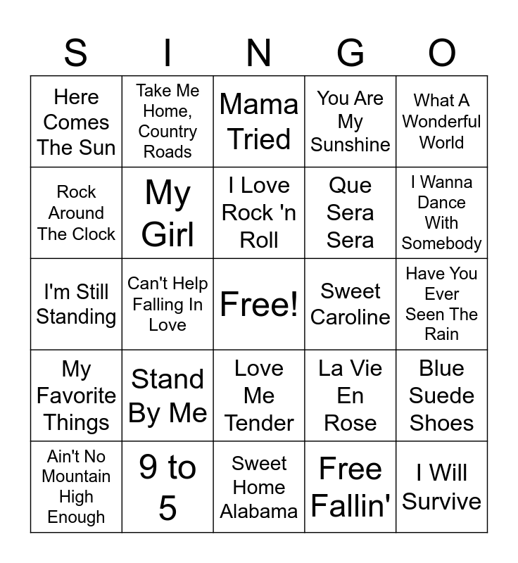 This bingo card has a free space and 29 words: Ain't No Mountain High Enough, Brown Eyed Girl, Can't Help Falling In Love, Fly Me To The Moon, Here Comes The Sun, Mama Tried, My Girl, Stand By Me, Sweet Caroline, 9 to 5, Have You Ever Seen The Rain, I Will Survive, Sweet Home Alabama, Free Fallin', I Wanna Dance With Somebody, My Heart Will Go On, Love Me Tender, My Favorite Things, What A Wonderful World, I'm Still Standing, La Vie En Rose, Old Time Rock and Roll, Que Sera Sera, Rock Around The Clock, You Are My Sunshine, Take Me Home, Country Roads, Blue Suede Shoes, I Love Rock 'n Roll and Yellow Submarine.