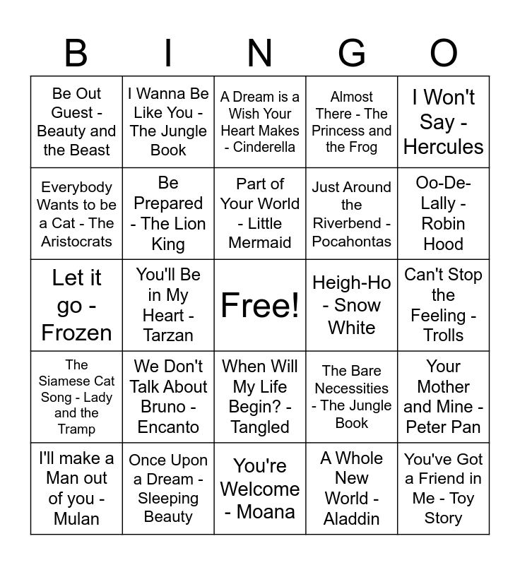This bingo card has a free space and 25 words: We Don't Talk About Bruno - Encanto, You're Welcome - Moana, Part of Your World - Little Mermaid, I'll make a Man out of you - Mulan, I Won't Say - Hercules, Be Out Guest - Beauty and the Beast, Everybody Wants to be a Cat - The Aristocrats, I Wanna Be Like You - The Jungle Book, Heigh-Ho - Snow White, When Will My Life Begin? - Tangled, Just Around the Riverbend - Pocahontas, Let it go - Frozen, The Bare Necessities - The Jungle Book, Your Mother and Mine - Peter Pan, Be Prepared - The Lion King, I'm Late - Alice in Wonderland, Can't Stop the Feeling - Trolls, A Dream is a Wish Your Heart Makes - Cinderella, Oo-De-Lally - Robin Hood, You'll Be in My Heart - Tarzan, You've Got a Friend in Me - Toy Story, Once Upon a Dream - Sleeping Beauty, The Siamese Cat Song - Lady and the Tramp, Almost There - The Princess and the Frog and A Whole New World - Aladdin.