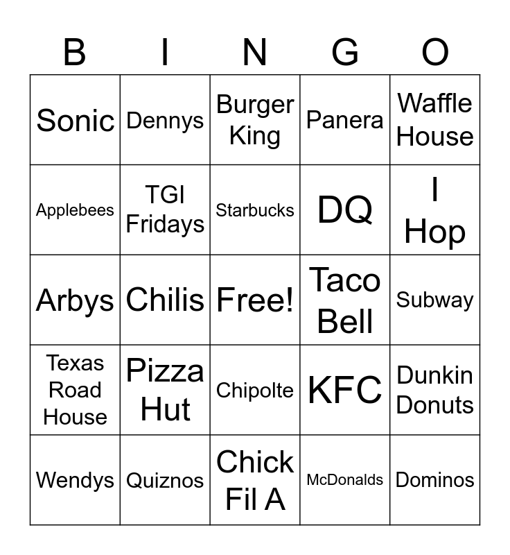This bingo card has a free space and 25 words: Pizza Hut, Chick Fil A, Starbucks, Wendys, Waffle House, Sonic, Applebees, Dennys, Taco Bell, Chipolte, DQ, Arbys, KFC, Dunkin Donuts, TGI Fridays, Craker Barrel, Subway, Burger King, I Hop, Chilis, Dominos, Quiznos, Texas Road House, Panera and McDonalds.