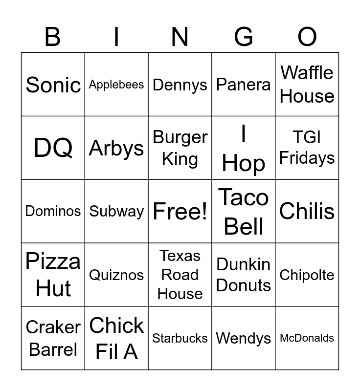 This bingo card has a free space and 25 words: Pizza Hut, Chick Fil A, Starbucks, Wendys, Waffle House, Sonic, Applebees, Dennys, Taco Bell, Chipolte, DQ, Arbys, KFC, Dunkin Donuts, TGI Fridays, Craker Barrel, Subway, Burger King, I Hop, Chilis, Dominos, Quiznos, Texas Road House, Panera and McDonalds.