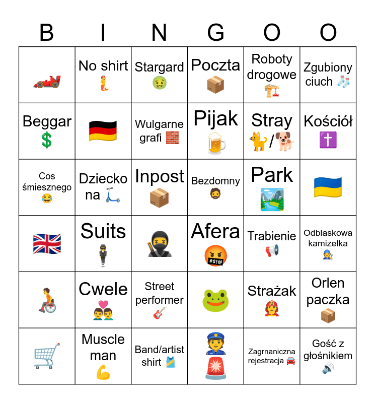 This bingo card has 36 words: ๐ธ, Street performer๐ธ, ๐ฎ ๐จ, Beggar ๐ฒ, ๐ฌ๐ง, Bezdomny ๐ง, ๐ฉ๐ช, Band/artist shirt ๐ฝ, Roboty drogowe ๐๏ธ, Straลผak๐งโ๐, Koลciรณล โ๏ธ, Poczta ๐ฆ, Orlen paczka ๐ฆ, Dziecko na ๐ด, Pijak ๐บ, ๐๏ธ, ๐งโ๐ฆฝ, Park๐๏ธ, Cos ลmiesznego ๐, Stargard ๐คข, Inpost ๐ฆ, Suits ๐ด๏ธ, Afera ๐คฌ, ๐ฅท, Trabienie ๐ข, No shirt ๐ง, Stray ๐/๐, Muscle man ๐ช, Wulgarne grafi ๐งฑ, Zgubiony ciuch ๐งฆ, Goลฤ z gลoลnikiem ๐, ๐, Odblaskowa kamizelka ๐งโ๐ง, ๐บ๐ฆ, Cwele ๐จโโค๏ธโ๐จ and Zagrnaniczna rejestracja ๐.