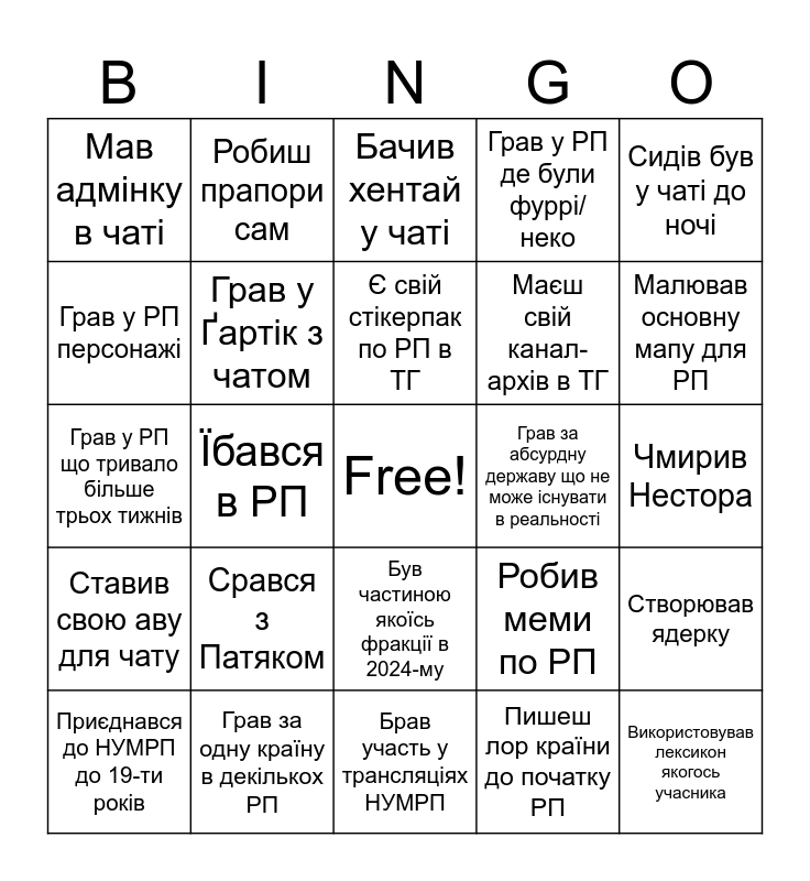 This bingo card has a free space and 24 words: Срався з Патяком, Грав за одну країну в декількох РП, Є свій стікерпак по РП в ТГ, Приєднався до НУМРП до 19-ти років, Сидів був у чаті до ночі, Мав адмінку в чаті, Грав у РП персонажі, Робиш прапори сам, Грав за абсурдну державу що не може існувати в реальності, Був частиною якоїсь фракції в 2024-му, Маєш свій канал-архів в ТГ, Грав у РП що тривало більше трьох тижнів, Робив меми по РП, Створював ядерку, Грав у Ґартік з чатом, Пишеш лор країни до початку РП, Чмирив Нестора, Бачив хентай у чаті, Малював основну мапу для РП, Їбався в РП, Використовував лексикон якогось учасника, Ставив свою аву для чату, Грав у РП де були фуррі/неко and Брав участь у трансляціях НУМРП.