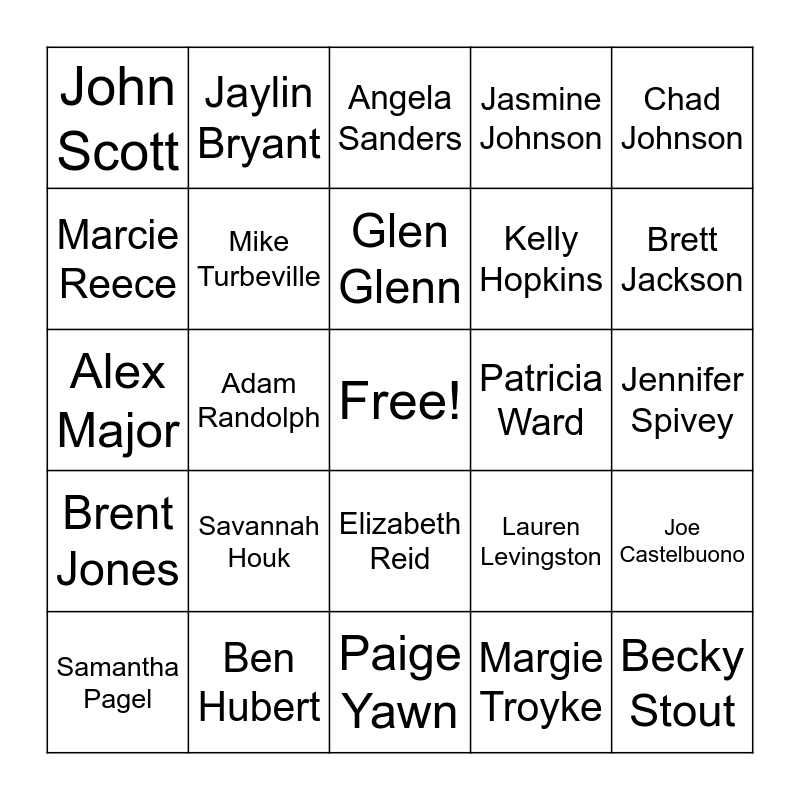 This bingo card has a free space and 105 words: Mike Lyttle, Jenifer Hall, Chad Johnson, Matt Buck, April Hagar, Susan Sims, Glenn Everett, Kendra Fleenor, Connor Lamberson, Heather Lenzy, Melinda Quinn, Leslie Hall, Hanna Adams, Destiny Dismore, Leesa Gant, Larissa Picard, Angela Sanders, Allison Swift, Heather Vivier, Derek Proctor, Alex Brodhag, Lauren Ebert, Gregory Fort, Denver Hall, Kori Hawk, Savannah Houk, Brett Jackson, Jasmine Johnson, Ladd Kuykendall, Chloe Randle, Lauren Levingston, Margie Troyke, Rebecca Hernandez, Brett Trotter, Peyton Anderson +1, Jennifer Bachman, Cassandra Beavers, Brandi Fisher Brown, Glen Glenn, Ben Hubert, Lela Jackson Dixon, Brent Jones, Andrea King, Marcie Reece, Isabella Sanders, John Scott, Karis Smith, Becky Stout, Jennifer Sullivan, Olivia Williams, Kathi Gibson, Heather Hammond, Clark Davis, John Dunn, David Hoover, David Howell, Dabney Kirk, Dalton Moss, LouEllen Pickard, Elizabeth Reid, Jennifer Spivey, Cecily Turkett, Harry Woods, Samera Zavaro, Robert P Miles, Brooke Duke, Lindsey Anderson, Jaylin Bryant, Alex Major, Adam Randolph, Paige Yawn, Lisa Forester, Charly Castelbuono, Brad Everett, Tania Goin, Scott Jenkins, Alyssa Manfredi, Alex Navin, Samantha Pagel, Christina Proctor, Devyn Ramsey, Andrew Schweighardt, Carolyn Shelton +1, Mike Turbeville, Mariah Walkup, Patricia Ward, Shelby Ybarra, Molly Shelby, Kendall Stoner, Chuck Hardy, Bailey Hartman, Andrea Parsons, Jennifer Shipman, JaQueya Oglivie, Joe Castelbuono, April Bramlage, Sarah Douglas, Christopher Garrell, Kelly Hopkins, Kayla Kelley, Melissa Klingaman, Laura Newberry, Dawn Swiney, Emily VanDegrift and Nikki Wirth.