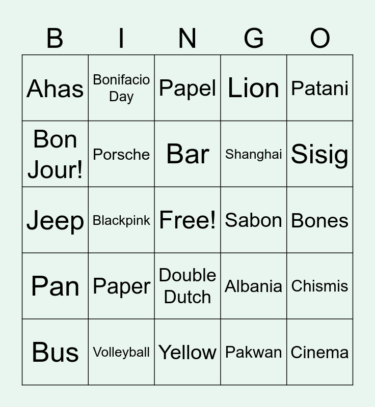 This bingo card has a free space and 24 words: Paper, Volleyball, Bar, Bus, Patani, Ahas, Bon Jour!, Bonifacio Day, Sabon, Double Dutch, Shanghai, Jeep, Albania, Chismis, Porsche, Pakwan, Bones, Papel, Sisig, Blackpink, Cinema, Pan, Lion and Yellow.
