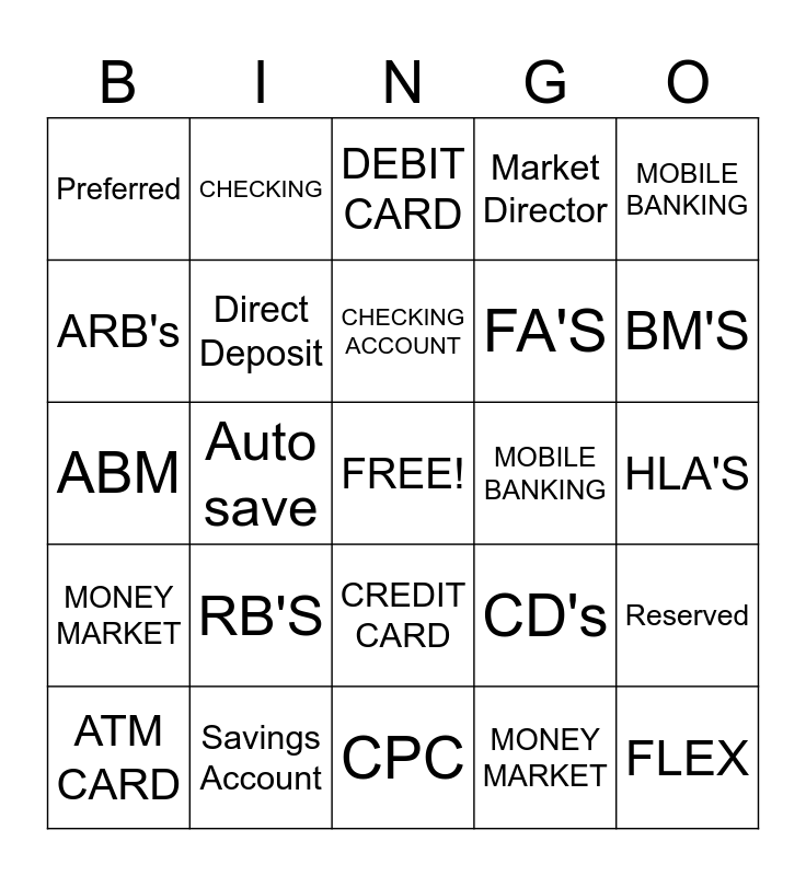 This bingo card has a free space and 24 words: RB'S, Savings Account, CHECKING ACCOUNT, ATM CARD, MOBILE BANKING, Preferred, ARB's, CHECKING, MOBILE BANKING, CREDIT CARD, FA'S, ABM, CD's, Reserved, Direct Deposit, MONEY MARKET, HLA'S, DEBIT CARD, BM'S, Auto save, FLEX, MONEY MARKET, Market Director and CPC.
