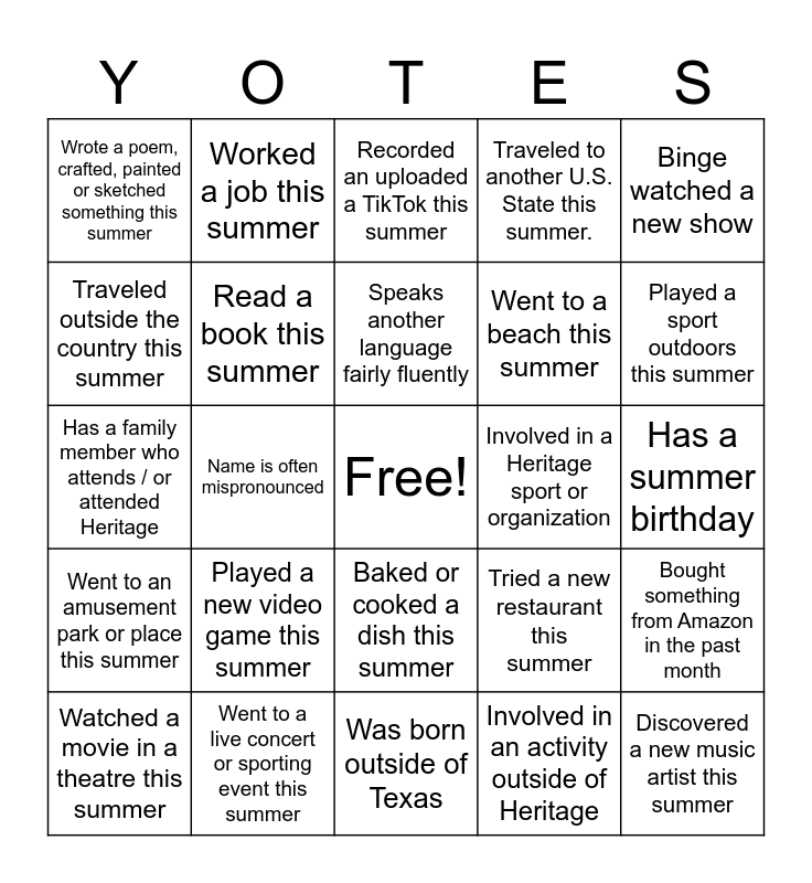 This bingo card has a free space and 24 words: Played a new video game this summer, Went to a live concert or sporting event this summer, Speaks another language fairly fluently, Watched a movie in a theatre this summer, Binge watched a new show, Wrote a poem, crafted, painted or sketched something this summer, Traveled outside the country this summer, Worked a job this summer, Involved in a Heritage sport or organization, Baked or cooked a dish this summer, Went to a beach this summer, Has a family member who attends / or attended Heritage, Tried a new restaurant this summer, Bought something from Amazon in the past month, Read a book this summer, Involved in an activity outside of Heritage, Has a summer birthday, Recorded an uploaded a TikTok this summer, Played a sport outdoors this summer, Name is often mispronounced, Discovered a new music artist this summer, Went to an amusement park or place this summer, Traveled to another U.S. State this summer. and Was born outside of Texas.