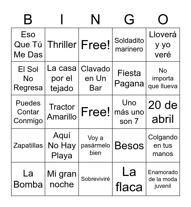 This bingo card has a free space and 84 words: Free!, Free!, Free!, Free!, ¡Chas! Y aparezco a tu lado, Sopa de Caracol, Todos los días sale el sol, Mayonesa, Que La Detengan, Física o química, Cien gaviotas, Resistiré, La casa por el tejado, Uno más uno son 7, Potra Salvaje, Eso Que Tú Me Das, La Bomba, El Sol No Regresa, No Puedo Vivir Sin Ti, La Morocha, Caminando por la vida, Fiesta Pagana, Enamorado de la moda juvenil, Ay Mamá, Tractor Amarillo, Ave María, Te Quiero Más, Bailando por Ahi, Ni Una Sola Palabra, Yo Quiero Bailar, Aquí No Hay Playa, Devuelveme La Vida, Opa Yo Viaze Un Corra, Puedes Contar Conmigo, Sarandonga, LA FALDA, Sobreviviré, Sarà perché ti amo, No importa que llueva, Zapatillas, Levantando las Manos, Tómbola, Mentirosa, Feo Fuerte y Formal, Macarena, Torero, Thriller, Bienvenidos, Viaje con nosotros, La Camisa Negra, Marta, Sebas, Guille y los demás, Besos, Soldadito marinero, Mirala Cara a Cara, Maquillaje, Aserejé, Mi gran noche, Clavado en Un Bar, Sólo Se Vive una Vez, 20 de abril, En Que Estrella Estara, Me Gustas Mucho, A quién le importa, Un Beso Y Una Flor, Cannabis, El Venao, Limón y Sal, Danza Kuduro, Lloverá y yo veré, Waka Waka, Colgando en tus manos, Cuando zarpa el amor, Echa Pa'lla (Manos Pa'rriba), Buleria, Voy a pasármelo bien, La flaca, Suavemente, Lady Madrid, Devuélveme a mi chica, Como una Ola, Despacito, No Rompas Mi Corazón, Antes Muerta Que Sencilla and Hay Quel Venir al Sur.