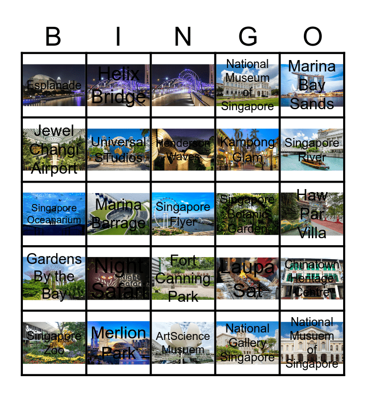 This bingo card has 25 images and 24 words: Gardens By the Bay, Merlion Park, Singapore Flyer, National Gallery Singapore, Marina Bay Sands, Esplanade, Helix Bridge, Singapore Botanic Garden, Chinatown Heritage Centre, Jewel Changi Airport, Universal STudios, ArtScience Musuem, Laupa Sat, Singapore River, Singapore Zoo, Marina Barrage, Henderson Waves, Kampong Glam, Haw Par Villa, Singapore Oceanarium, Night Safari, Fort Canning Park, National Museum of Singapore and National Musuem of Singapore.