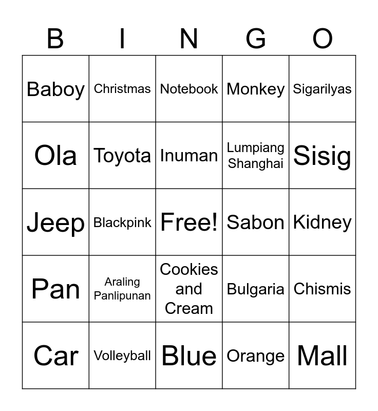 This bingo card has a free space and 24 words: Araling Panlipunan, Volleyball, Inuman, Car, Sigarilyas, Baboy, Ola, Christmas, Sabon, Cookies and Cream, Lumpiang Shanghai, Jeep, Bulgaria, Chismis, Toyota, Orange, Kidney, Notebook, Sisig, Blackpink, Mall, Pan, Monkey and Blue.