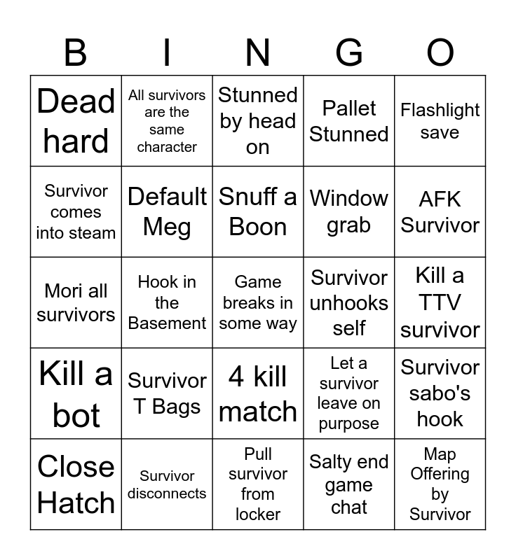 This bingo card has 25 words: Survivor T Bags, Pull survivor from locker, Snuff a Boon, Close Hatch, Flashlight save, Dead hard, Survivor comes into steam, All survivors are the same character, Survivor unhooks self, 4 kill match, Window grab, Mori all survivors, Let a survivor leave on purpose, Survivor sabo's hook, Default Meg, Map Offering by Survivor, Kill a TTV survivor, Stunned by head on, AFK Survivor, Hook in the Basement, Game breaks in some way, Survivor disconnects, Kill a bot, Pallet Stunned and Salty end game chat.