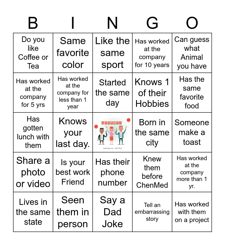 This bingo card has a free space and 24 words: Is your best work Friend, Seen them in person, Started the same day, Lives in the same state, Can guess what Animal you have, Do you like Coffee or Tea, Has worked at the company for 5 yrs, Same favorite color, Born in the same city, Has their phone number, Knows 1 of their Hobbies, Has gotten lunch with them, Knew them before ChenMed, Has worked at the company more than 1 yr., Has worked at the company for less than 1 year, Tell an embarrassing story, Someone make a toast, Like the same sport, Has the same favorite food, Knows your last day., Has worked with them on a project, Share a photo or video, Has worked at the company for 10 years and Say a Dad Joke.