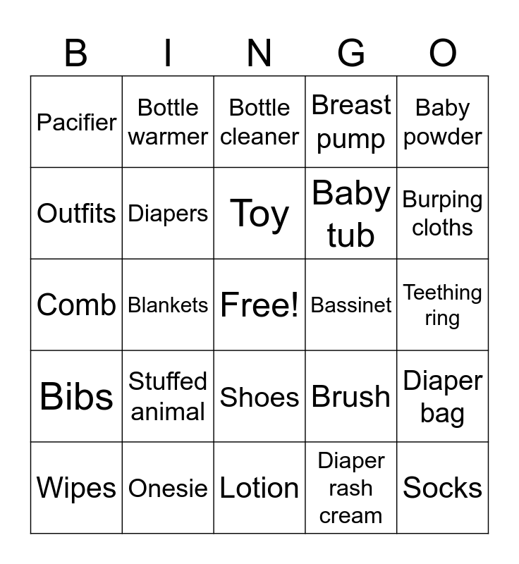 This bingo card has a free space and 29 words: Wipes, Books, Blankets, Bottles, Pacifier, Bottle cleaner, Diapers, Stuffed animal, Bassinet, Onesie, Teething ring, Socks, Lotion, Diaper rash cream, Burping cloths, Washcloths, Shoes, Bibs, Baby powder, Comb, Brush, Manicure kit, Baby tub, Outfits, Breast pump, Bottle warmer, Diaper bag, Toy and Pacifier holder.